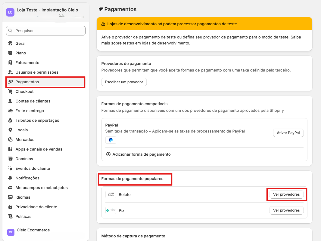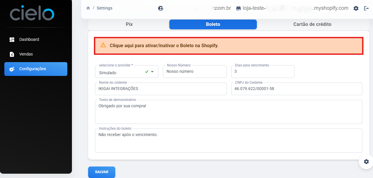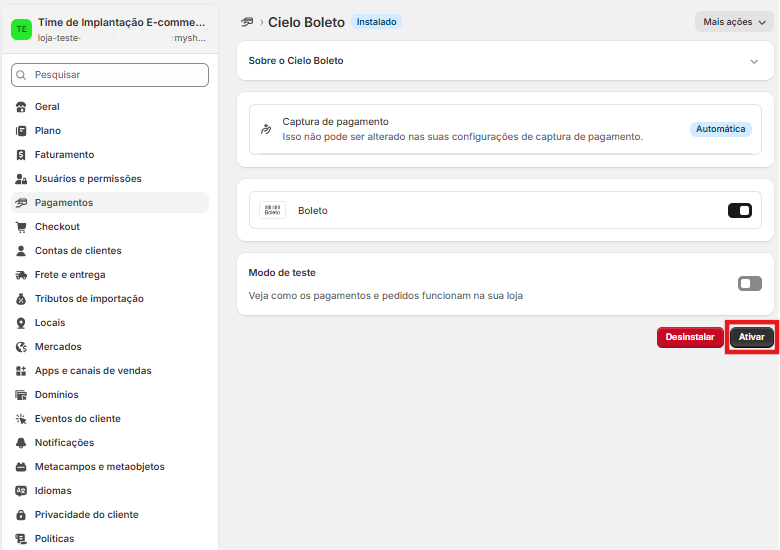 1. Clique novamente na aba Boleto. Em seguida, clique no aviso indicando para ativar o meio de pagamento na Shopify;