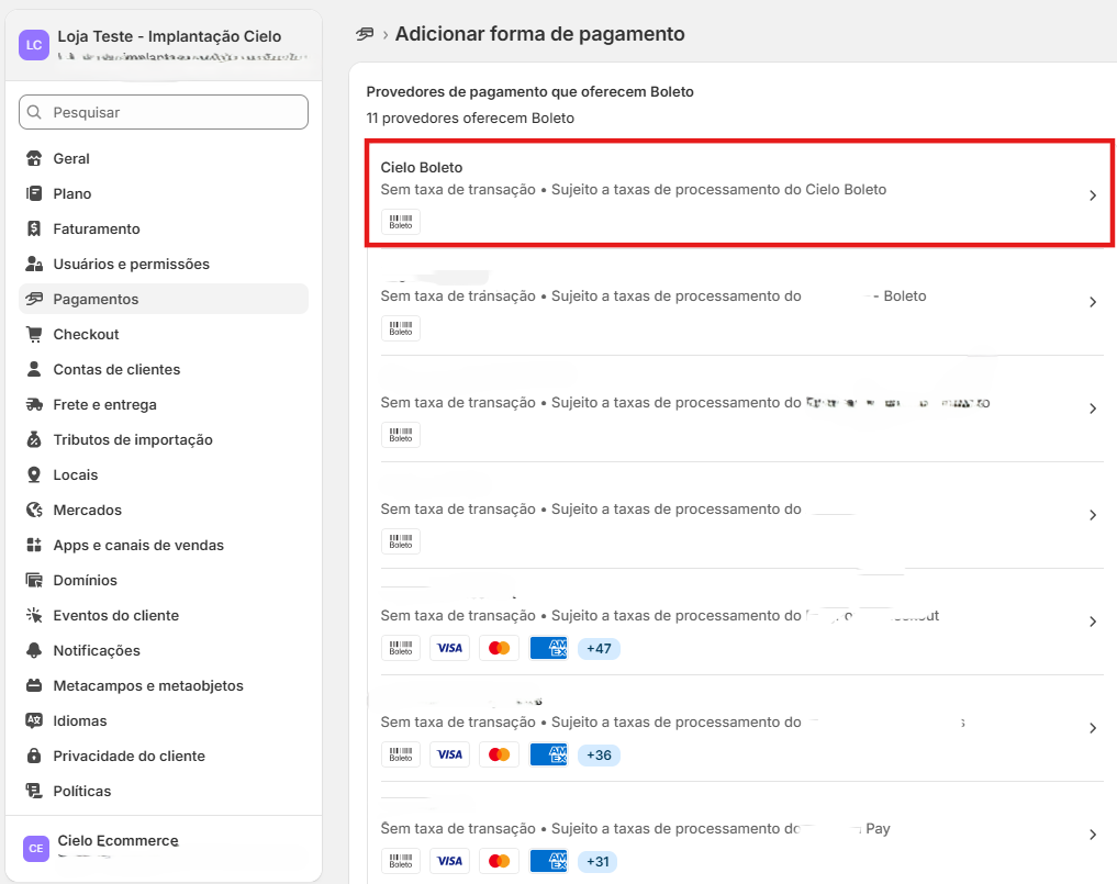 4- Em Adicionar forma de pagamento selecione Cielo Boleto;