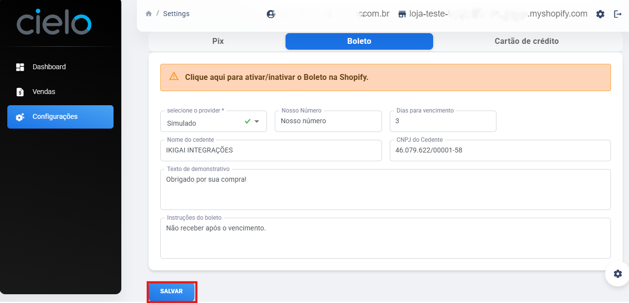 VocĂȘ receberĂĄ uma mensagem de confirmação indicando que o Cielo Boleto foi ativado e estĂĄ pronto para uso.