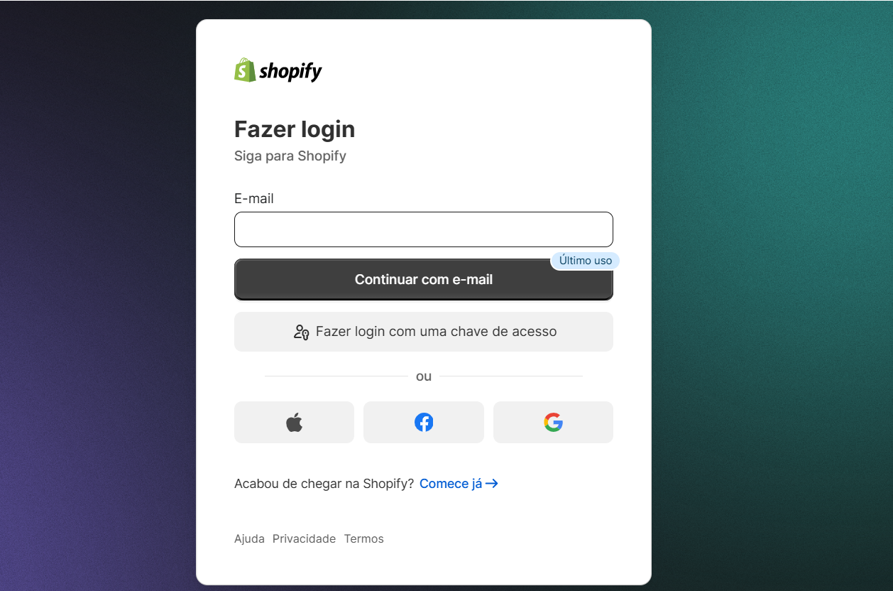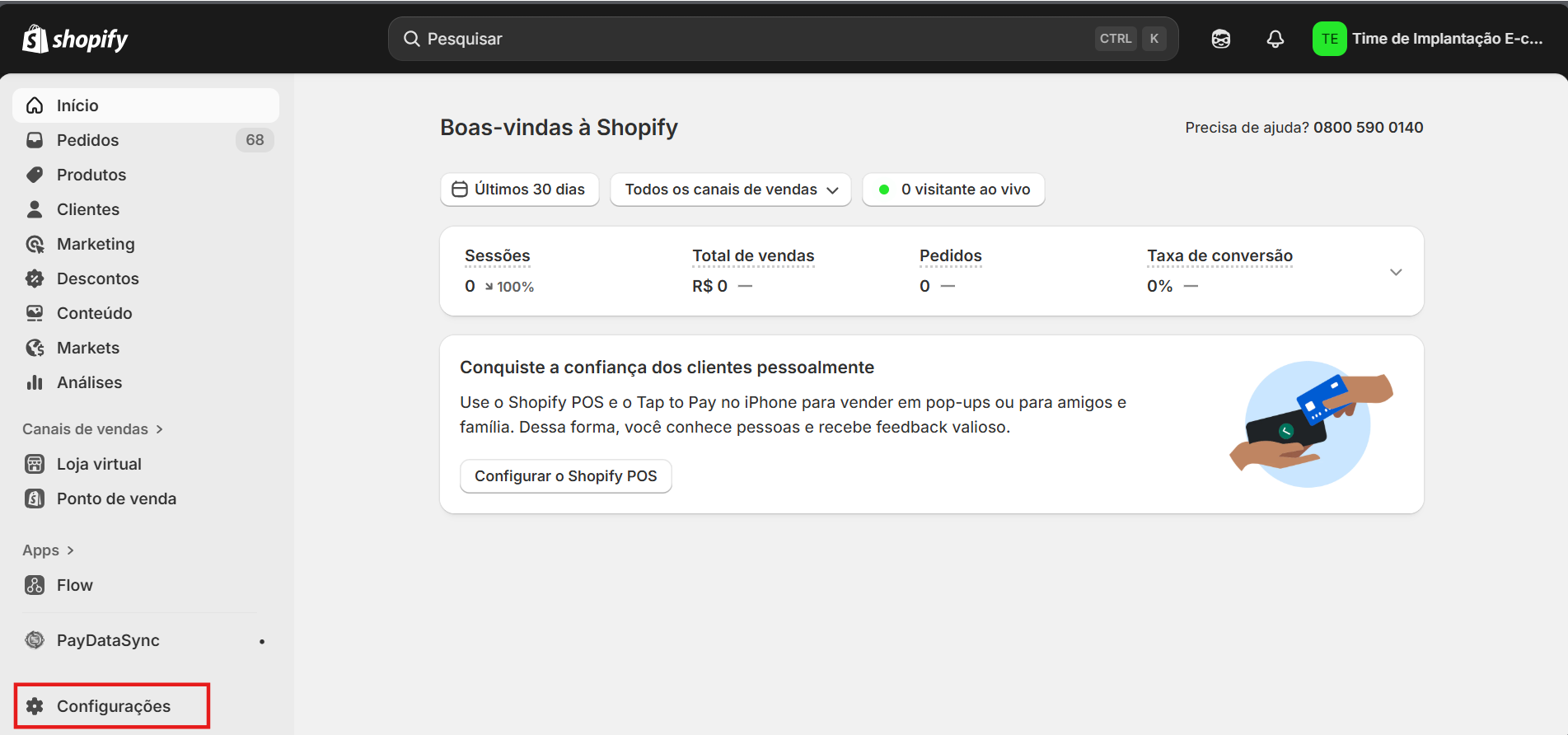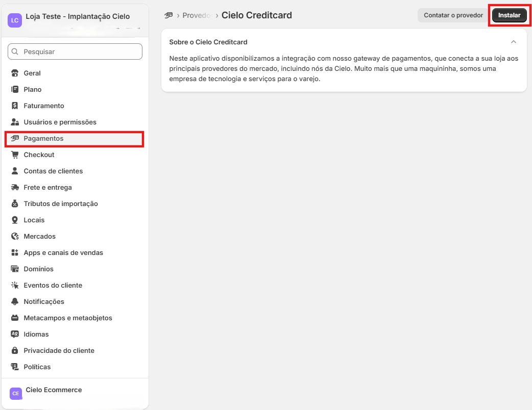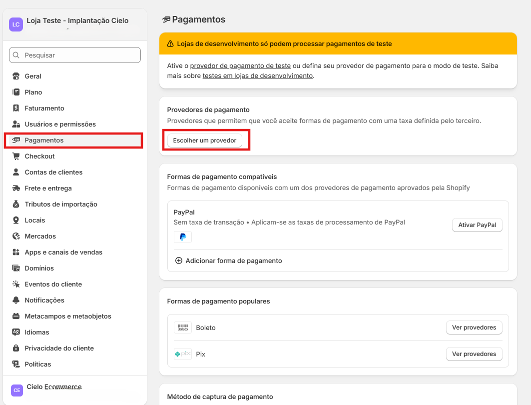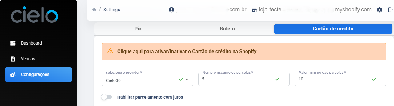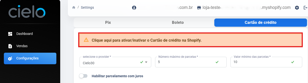 - Clique novamente na aba Cartão de Crédito. Em seguida, clique no aviso indicando para ativar o meio de pagamento na Shopify;