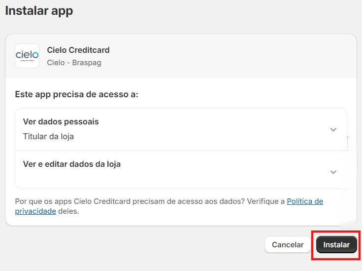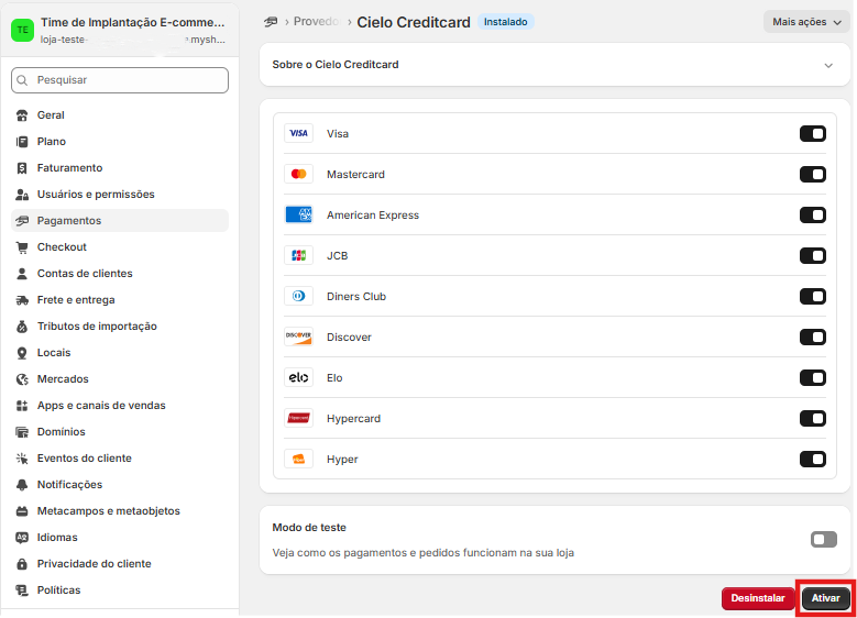 - Após ser redirecionado para a Shopify, selecione quais bandeiras de cartão de crédito poderão ser utilizadas e clique em Ativar.