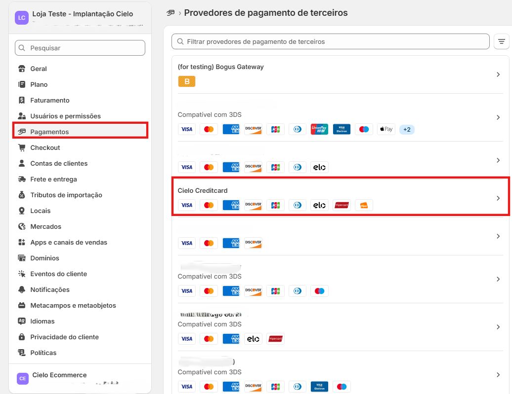 - Em Provedores de pagamento de terceiros , selecione Cielo CreditCard;