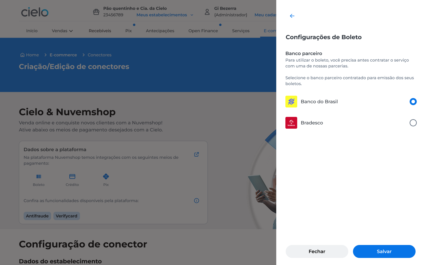 Após a contratação, selecione o banco parceiro na interface de configuração da Nuvemshop para ativar o meio de pagamento.