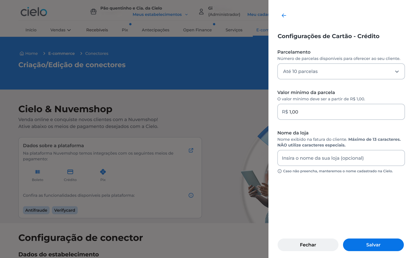 Nome da loja (exibido na fatura) | Informação apresentada na fatura do cartão do comprador. Não aceita caracteres especiais. Apenas 13 caracteres. |