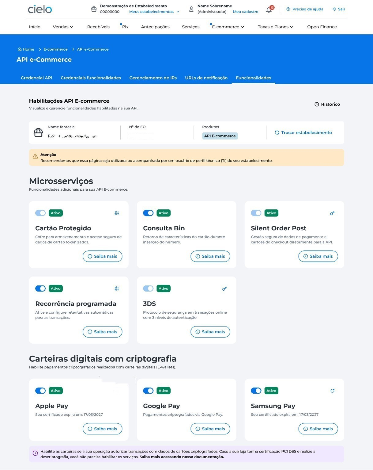 You can enable the e-wallets: Apple Pay, Google Pay, and Samsung Pay directly on the Cielo Portal. To enable them, follow the steps below: