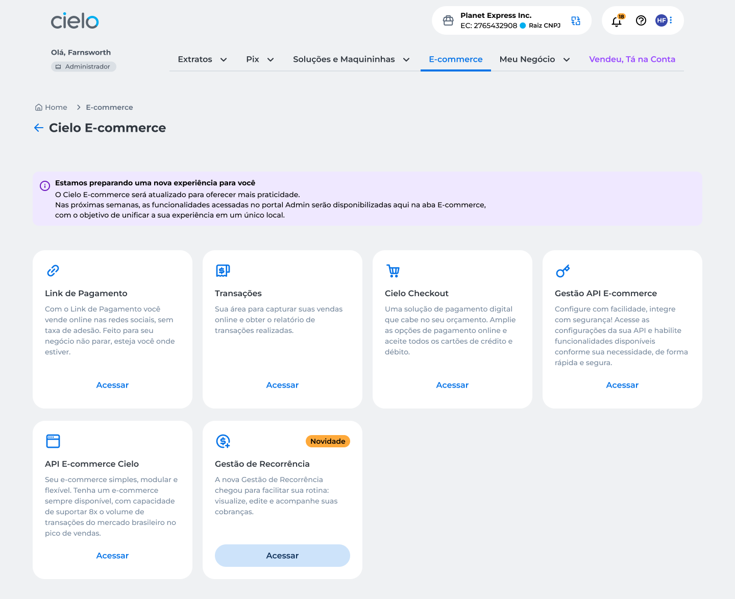 - Ao finalizar o login, clique em E-commerce na página inicial. Você irá visualizar as funcionalidades do e-commerce Cielo:
