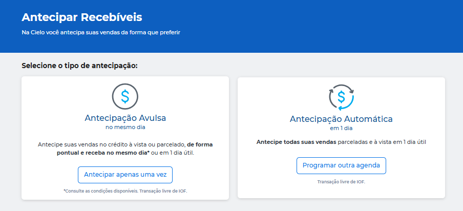 Você pode escolher entre Atecipação Avulsa, que antecipa apenas uma vez ou Antecipação Automática, que programa uma agenda de antecipação: