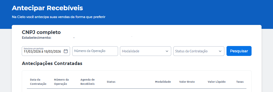 Em Solicitações Realizadas, você poderá consultar suas antecipações recentes. Clique em Ver histórico completo para consultar todo o histórico de antecipações:
