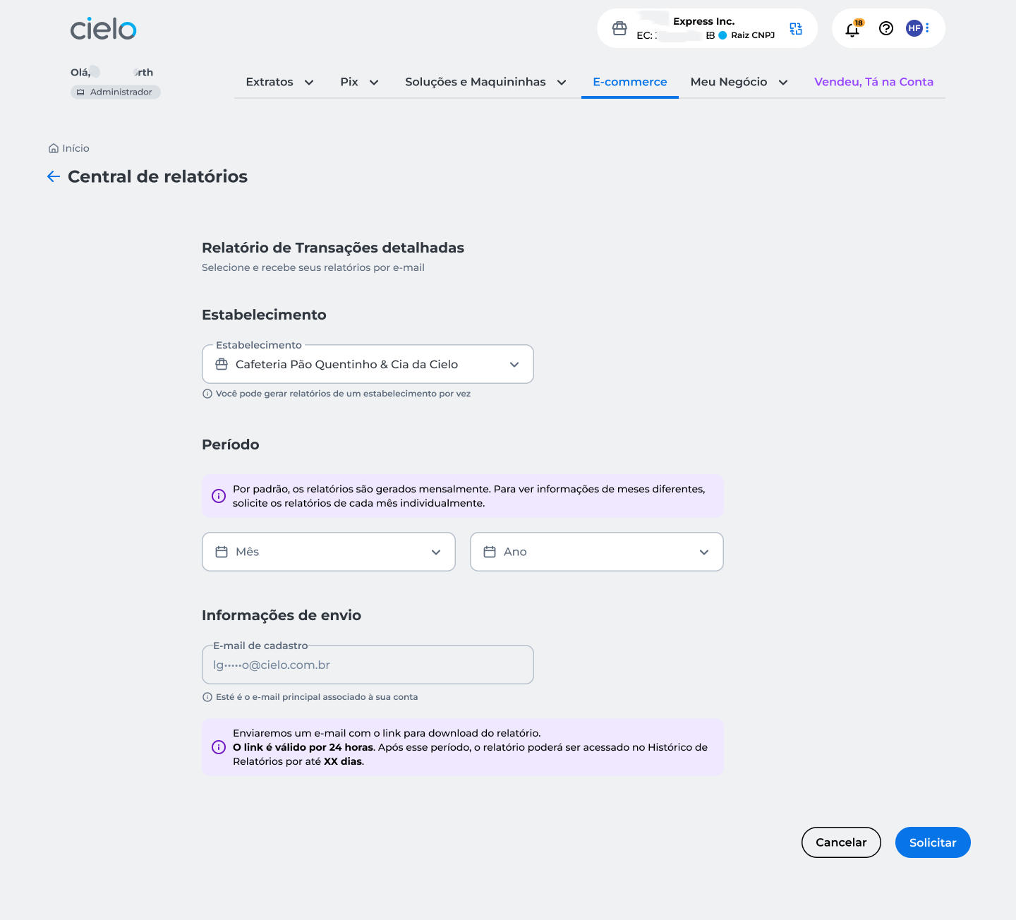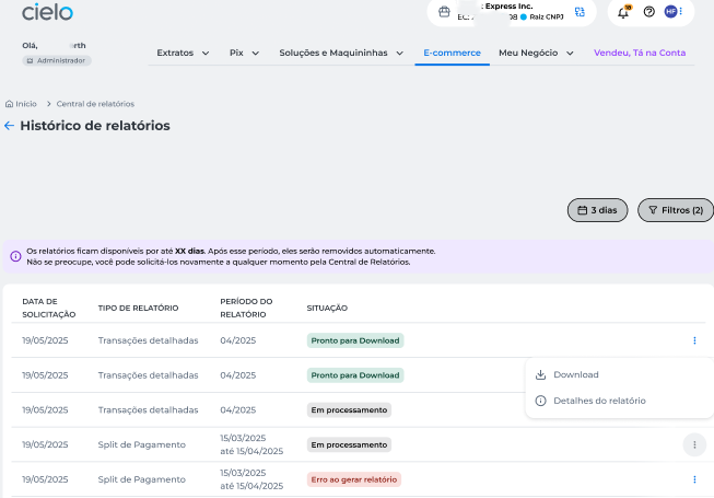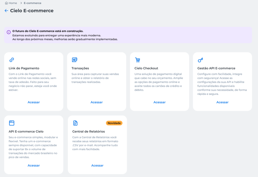 - Os relatórios disponíveis na Central de Relatórios são exclusivos para clientes da API E-commerce Cielo;