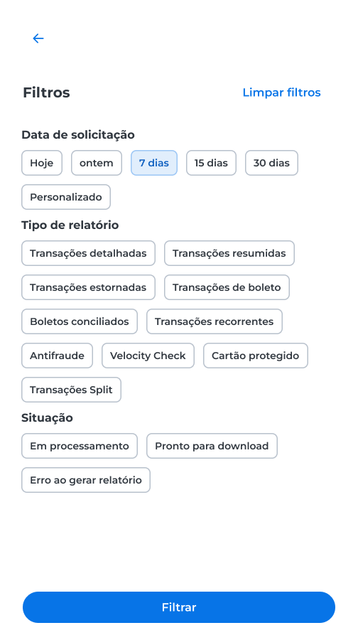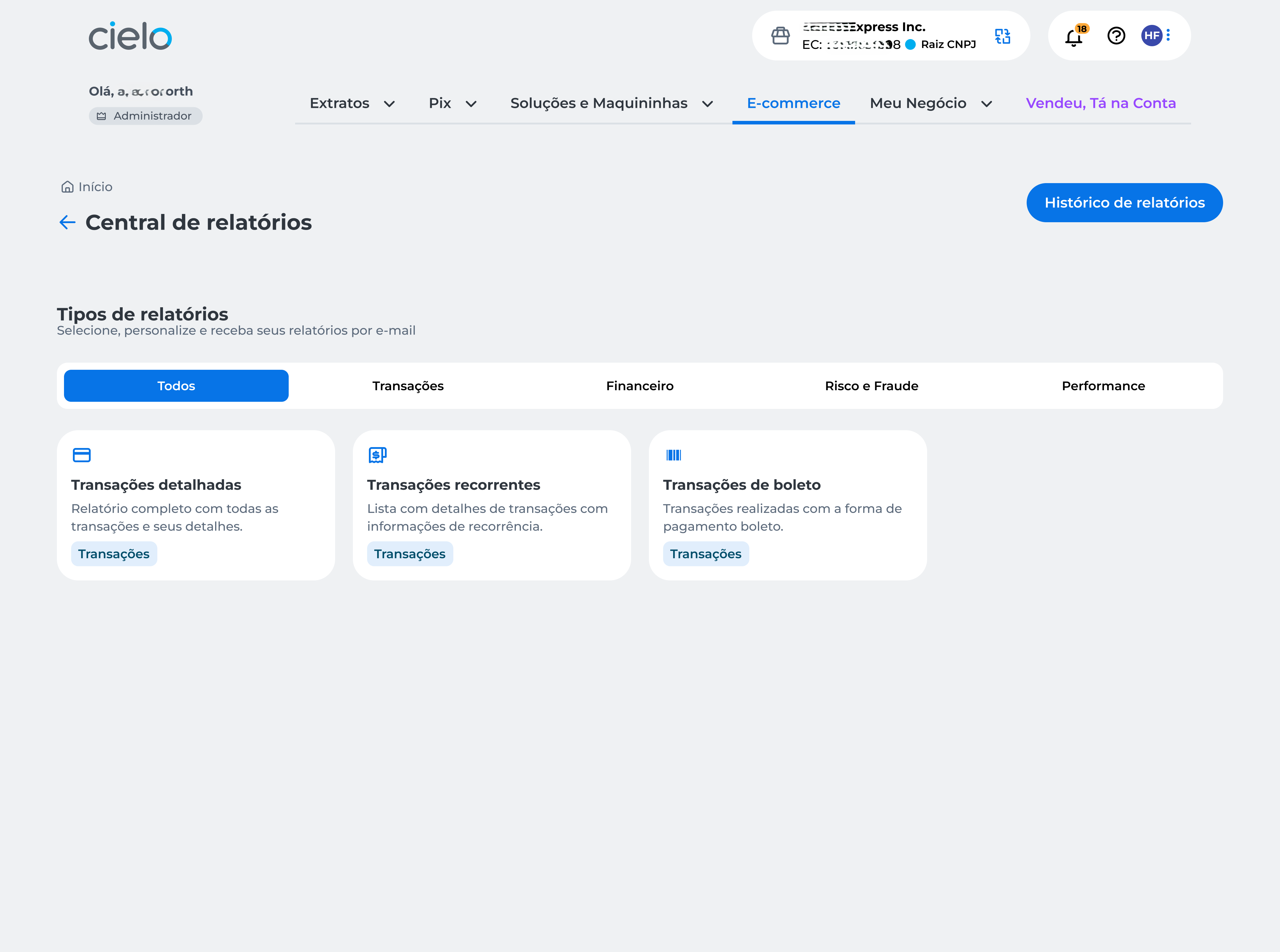 A Central de Relatórios está disponível para que você consulte os principais relatórios relacionados às suas transações e configurações.