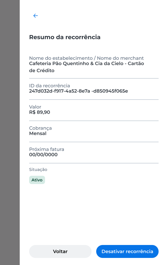 - A tela irá exibir o Resumo da recorrência, para conferência das informações da recorrência selecionada. Clique em Desativar recorrência: