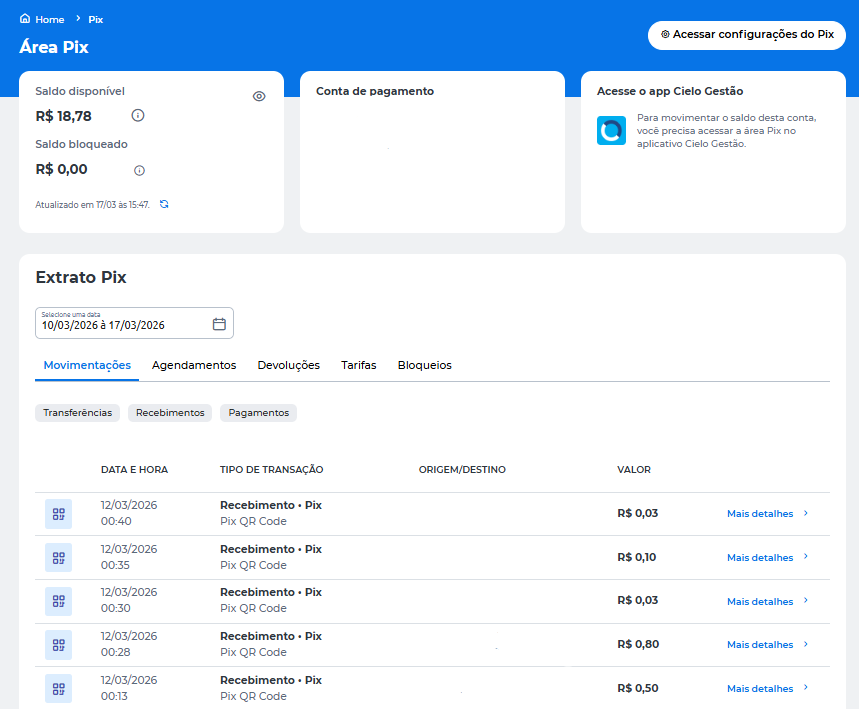 Em Pix > Extrato Pix, você pode consultar seu extrato de transações Pix. É possível filtrar por data, tipo de transação, agendamentos, devoluções, tarifas e bloqueios: