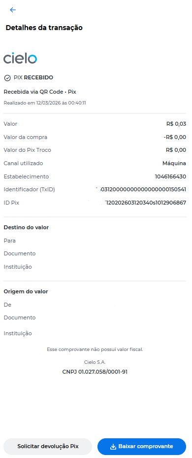 Ao consultar uma transação, é possível também baixar seu comprovante ou solicitar uma devolução: