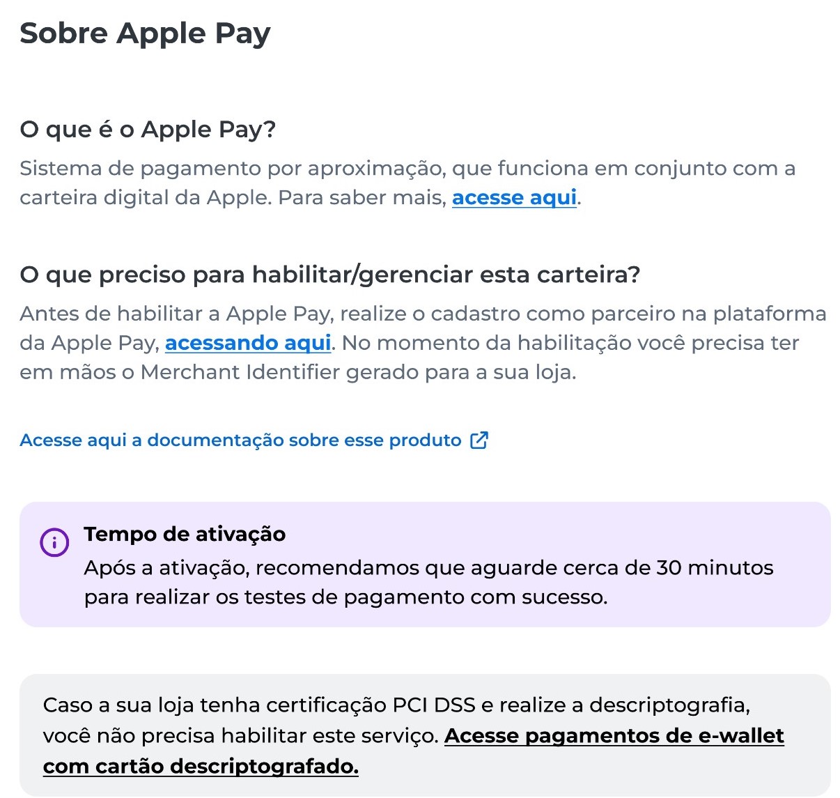 - Pronto, a habilitação está ativa com sucesso e você já pode visualizar a documentação para finalizar a integração com o provedor.