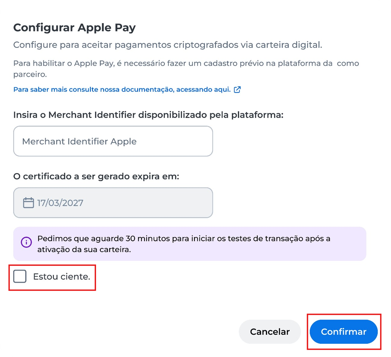 - Insira o Merchant Identifier disponibilizado pela plataforma e a data de expiração, em seguida clique em Estou ciente e em Confirmar;