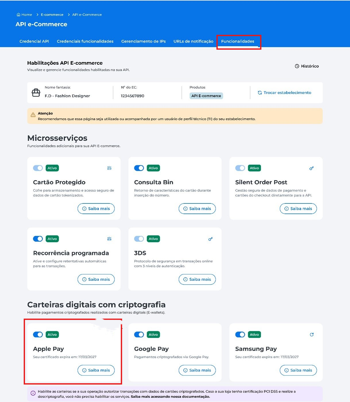- Na aba Funcionalidades em Carteiras digitais com criptografia habilite Apple Pay;