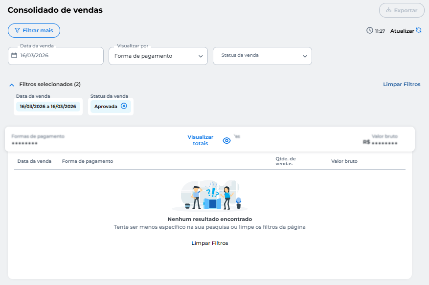 Em Consolidado de vendas, você pode filtrar suas vendas por data de venda, forma de pagamento ou status da venda:
