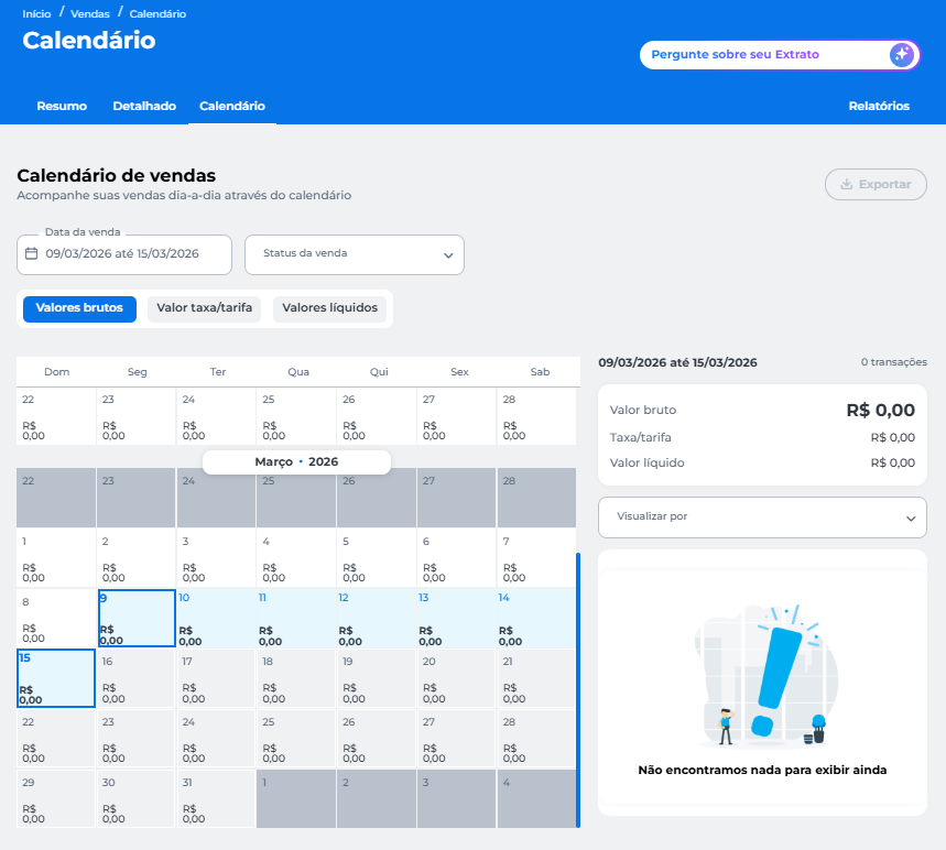 É possível filtrar por data da venda e status da venda. Também é possível visualizar valores brutos, valores de taxas/tarifas e valores líquidos: