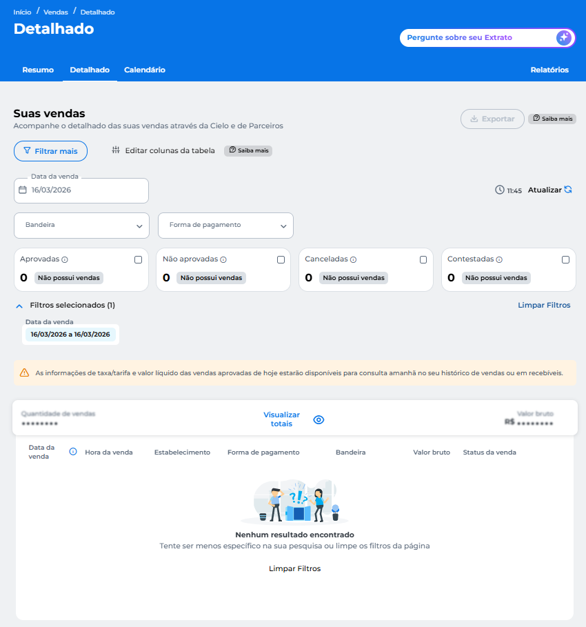 Em Vendas > Minhas vendas > Detalhado, você pode conferir suas vendas de forma detalhada, com mais filtros disponíveis para resultados precisos: