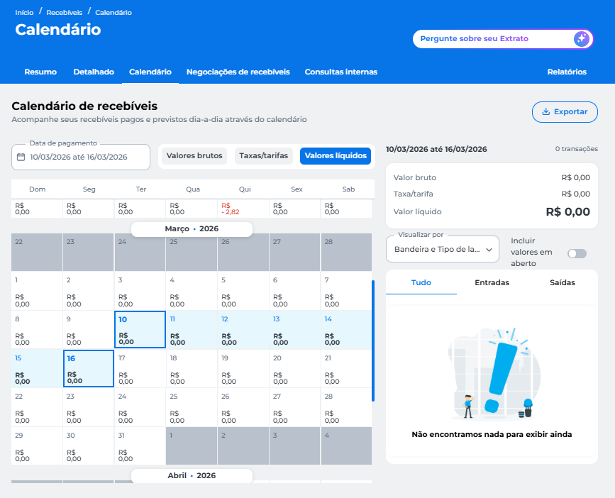 Em Recebíveis > Calendário, você pode acompanhar seus recebíveis pagos e previstos.