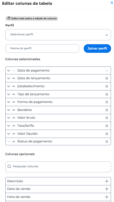 Clique em Editar colunas da tabela para personalizar as informações disponíveis: