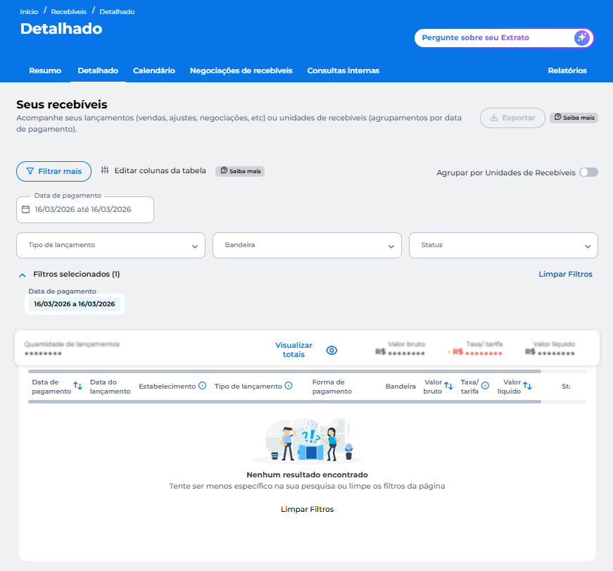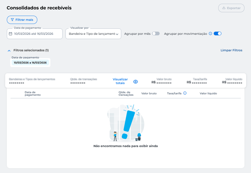 Em Consolidado de recebíveis, você pode filtrar seus recebíveis de forma agrupada: