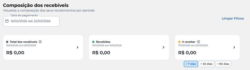 Em Composição dos recebíveis, você verá a composição dos seus recebimentos sendo possível filtrar por data de pagamento: