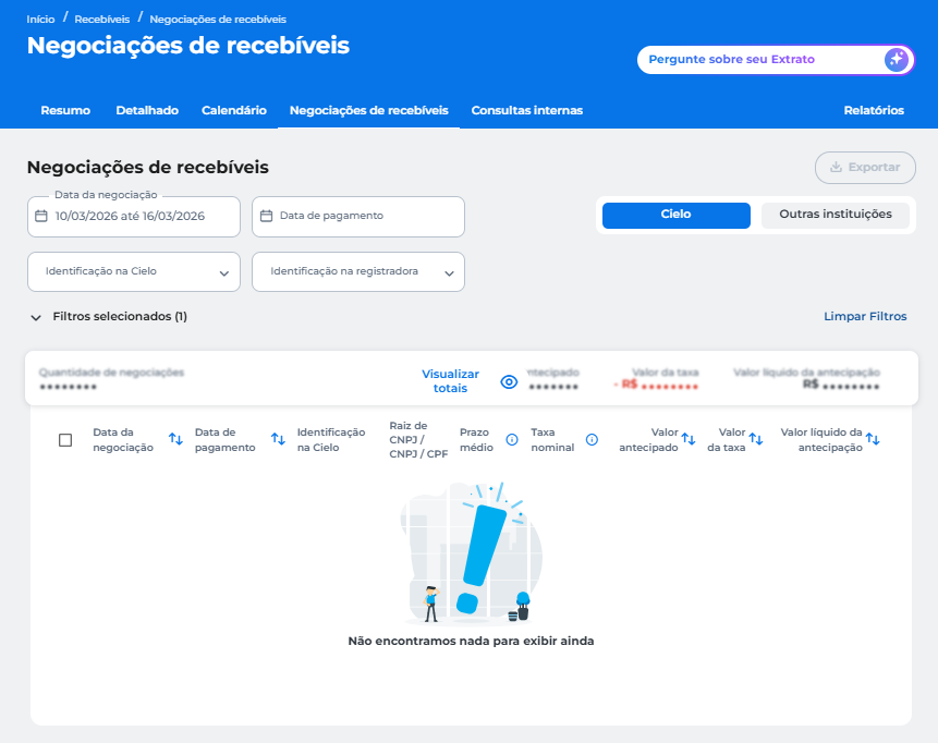 Em Recebíveis > Negociações de recebíveis, é possível consultar suas negociações de recebíveis usando filtros como data da negociação, data de pagamento, identificação na Cielo e identificação na registradora: