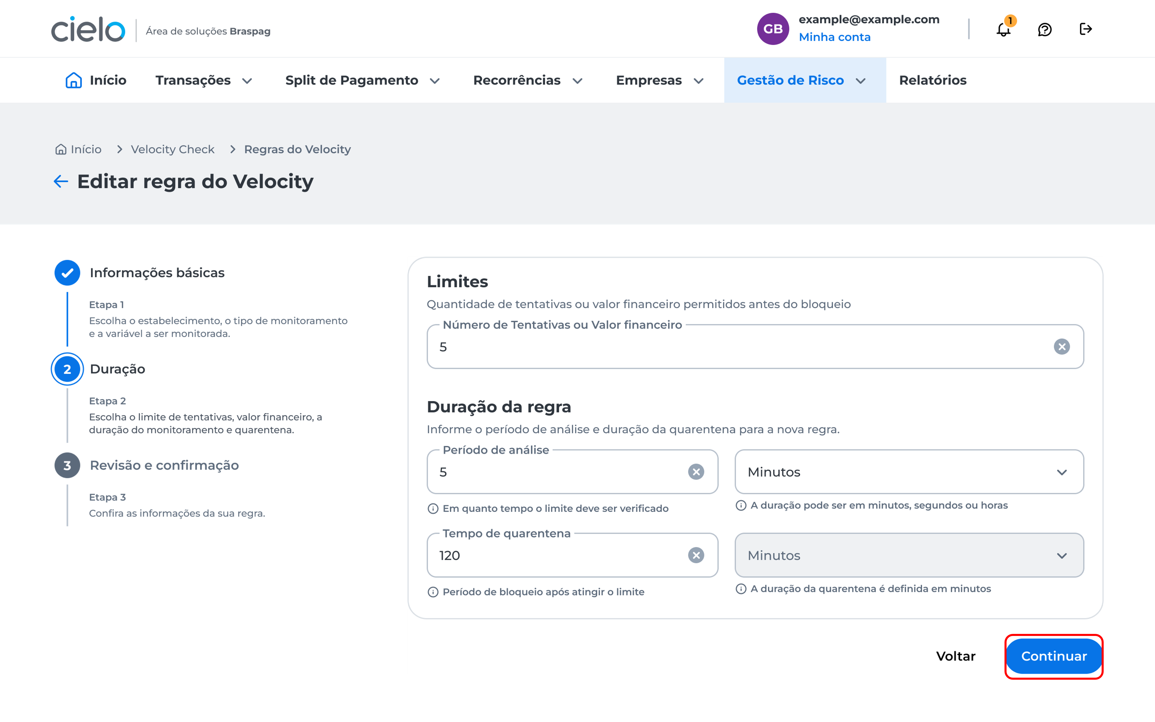 Choose the limits related to the monitoring type selected in the previous step, the duração da regra, and click Continuar: