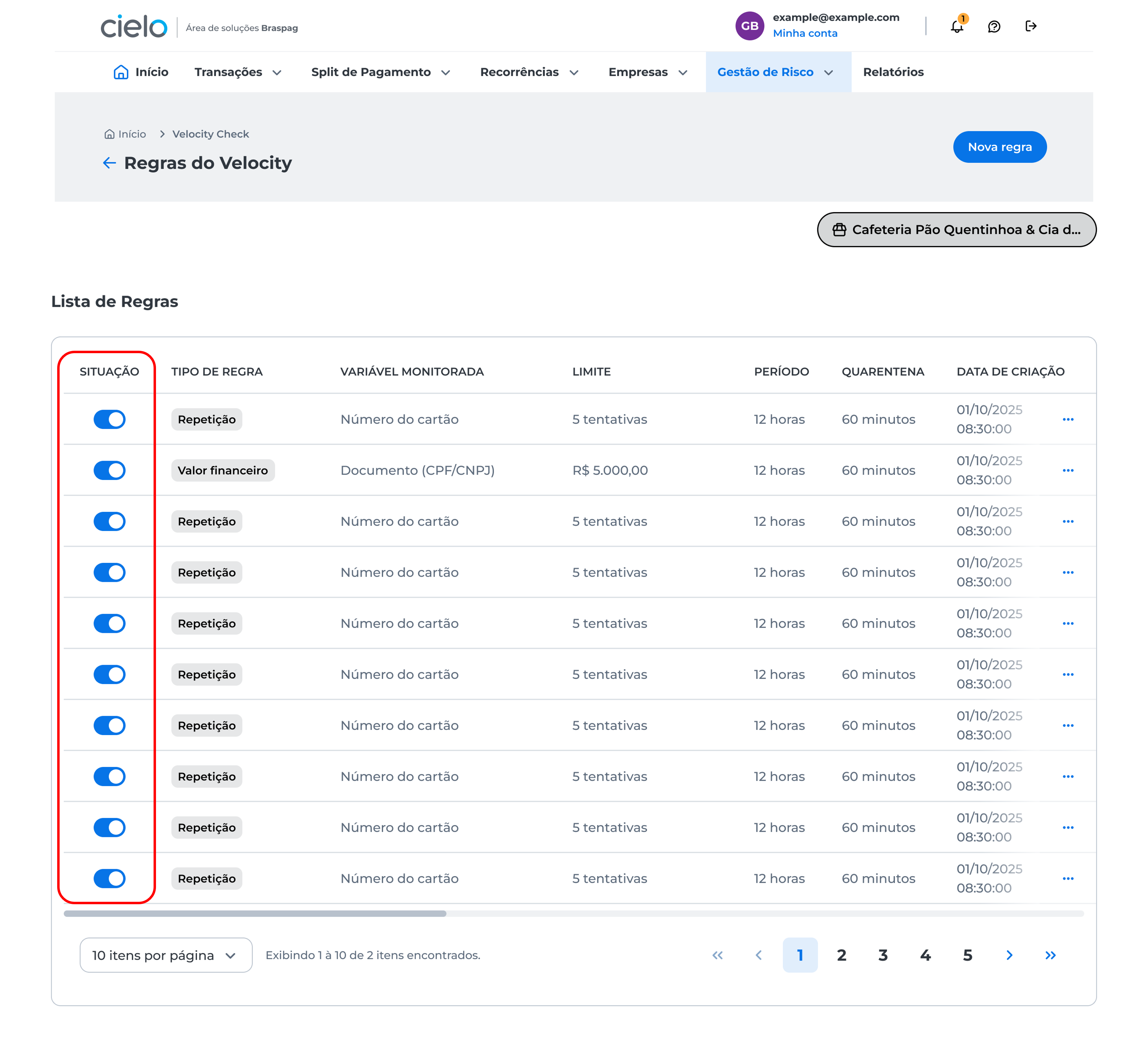 In the Situação column of the rules list, click the button to enable or disable a rule: