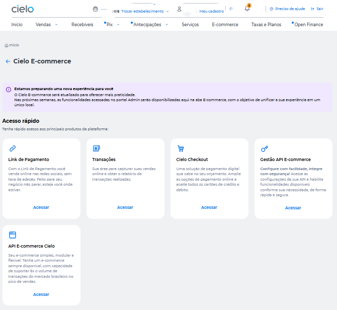 After accessing the Cielo website, click on the E-commerce menu in the upper corner of the screen. Then click on Acessar under Link de Pagamento: