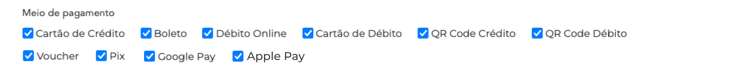 Em seguida, vá para E-commerce > Meus Links > Configurações > Meus meios de pagamento ativos e selecione a opção Apple Pay.