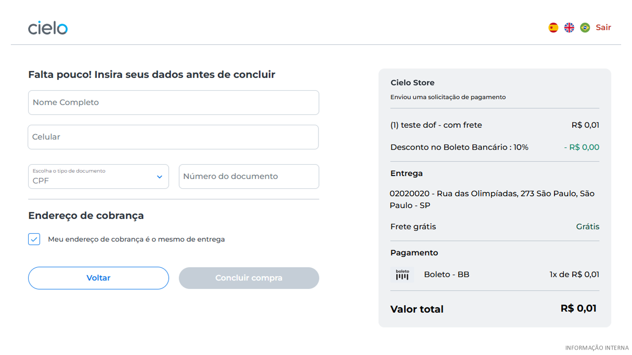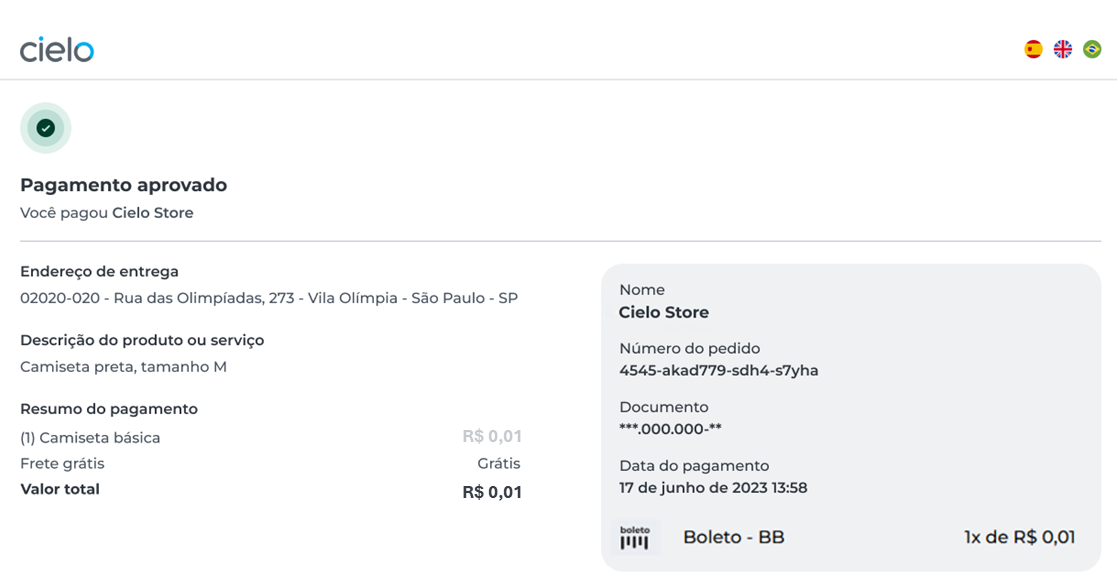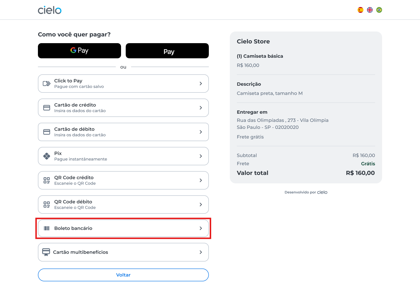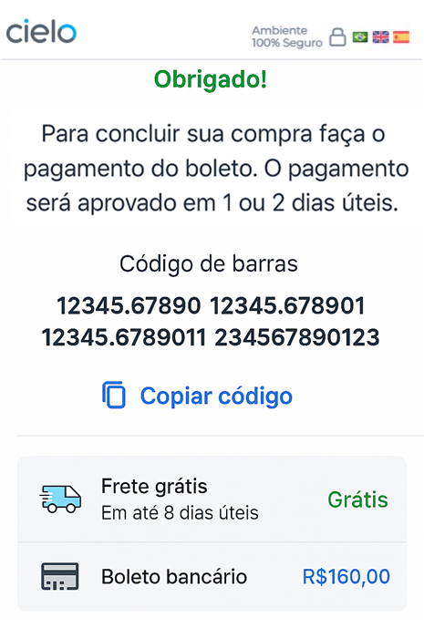 Confira a seguir um exemplo de como são as telas de pagamento via Boleto na jornada de pagamento do seu cliente.