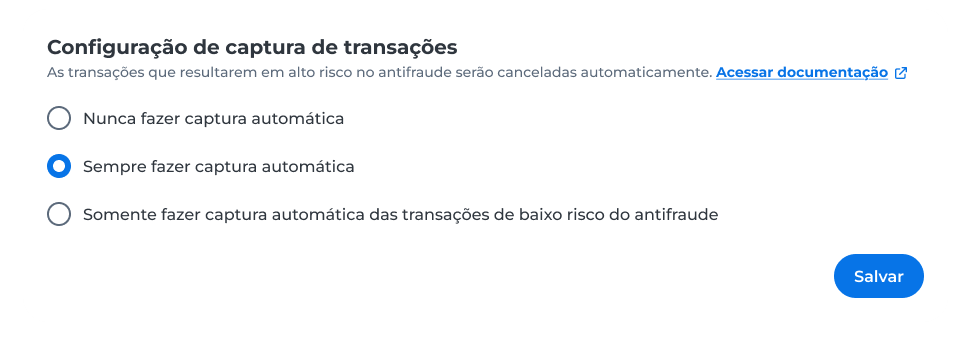 Ao acessar as configurações da sua loja, procure a sessão Antifraude e captura automática. Selecione a opção desejada: