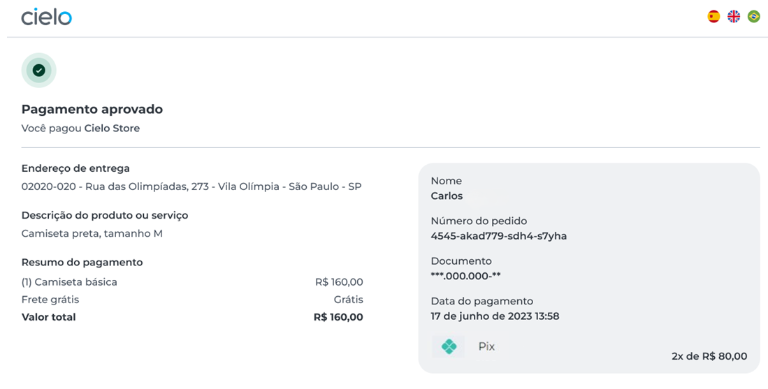 - Após o pagamento aprovado, a tela de resumo do pedido é exibida: