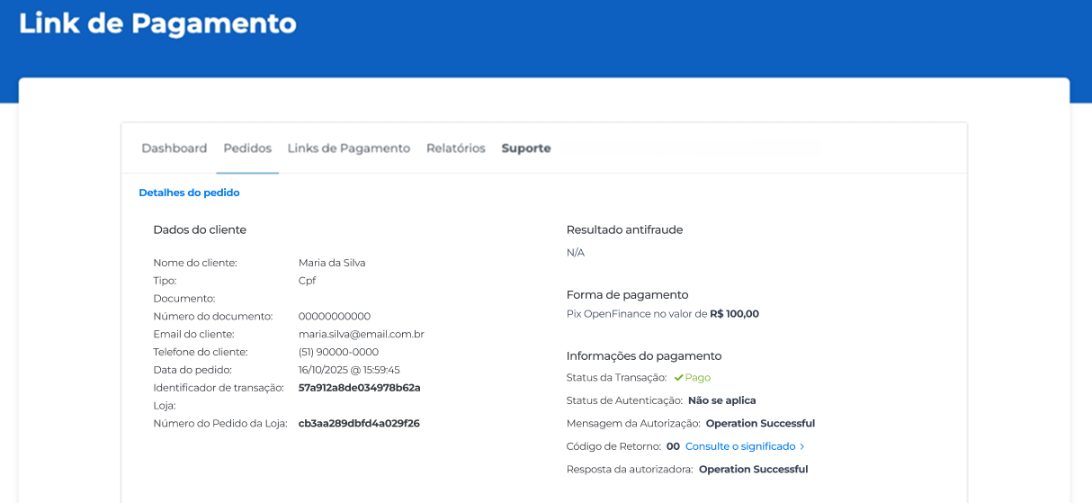 A busca irá retornar a lista de pedidos realizados com o Pix via Open Finance: