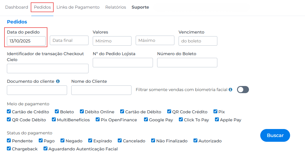 No site da Cielo, acesse E-commerce > Meus Links > Pedidos para visualizar a lista de pedidos. É possível filtrar pelo meio de pagamento Pix via Open Finance :
