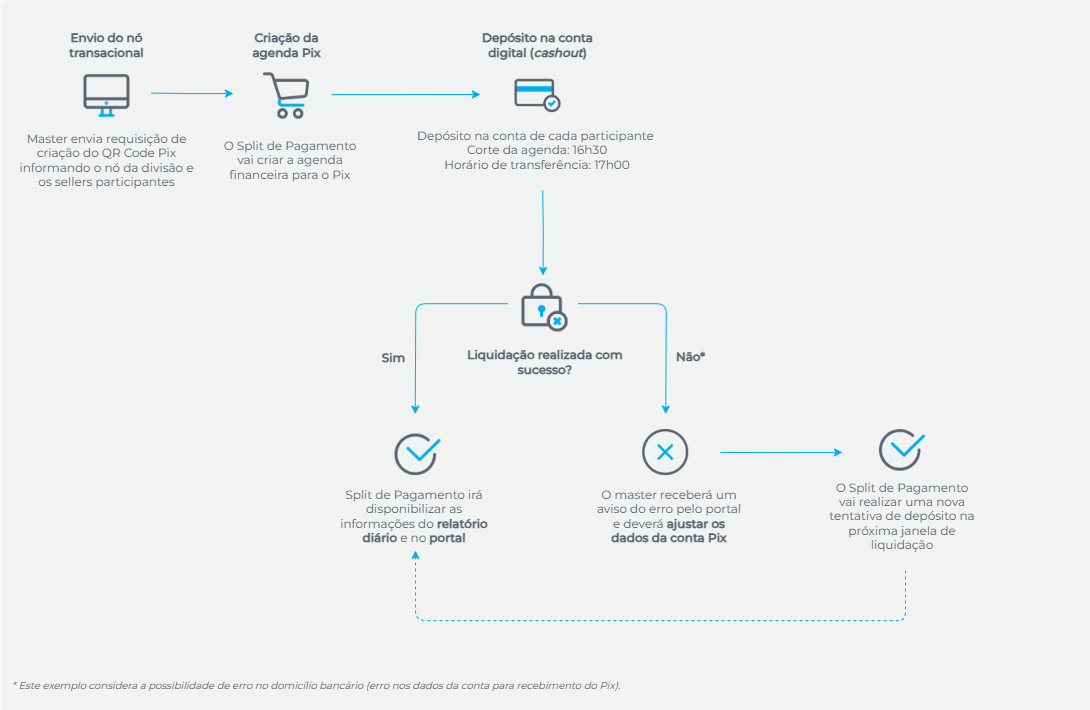 - Erro de liquidação: caso haja erro na liquidação por problema no domicílio bancário, o master deverá realizar ajustes nas informações do domicílio e após o ajuste os pagamentos pendentes acontecerão na próxima janela.